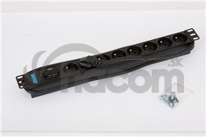 19 "rozvodný panel 1U, 8x zásuvka podľa STN, max 16A, kábel 3x1,5mm, 2m + zástrčka univerzál CZ-DE max. 16A,