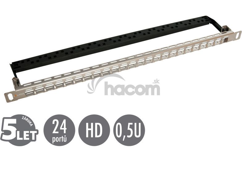 PREHĽADNeosazený patch panel s označením SX24HDM-0-STP-SL-UNI je univerzálny vysokohustotný 19 "modulárny patch panel, ktorý je určený pre 24 Keystone štruktúrovanej kabeláže Solarix. Panel je kompatibilný s keystony z produktových radov Solarix - kategória 5E, Solarix - kategória 6 aj Solarix kategórie 6A, ktoré majú svorkovnicu otočenou dozadu (tj. takmer všetky keystony Solarix okrem SXKJ-5E-UTP-BK-90 a SXKJ-5E-UTP-BK-D). Modulárne prevedenie patch panelu umožňuje pohodlnú inštaláciu Keystone a vďaka vyvazovací lište, ktorá je súčasťou dodávky panelu, aj prehľadné vyviazanie a pevné uchytenie dátového kábla priamo k telu panela. Farba tohto univerzálneho patch panelu Solarix je strieborná, veľkosť v dátovom rozvádzači je 0,5U. v prípade potreby je možné zaslepiť voľné porty záslepkou SXKJ- 0-BK.