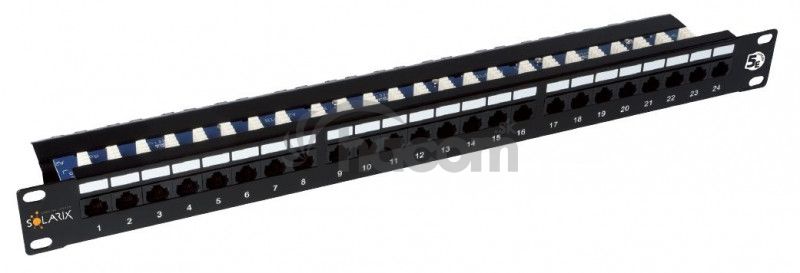 Patch panel Solarix s označením SX24L-5E-UTP-BK je panel osazený 24 porty RJ45, jehož součástí je vyvazovací lišta sloužící k pevnému uchycení a přehlednému uspořádání kabelů. Datový kabel se zakončuje do duální IDC svorkovnice typu 110/Krone – tj. k zařezání lze použít nástroj typu 110 i Krone. Svorkovnice je z důvodu snadného zakončení kabelu označena podle standardu T568A i T568B, a to za pomoci barev párů a číselného označení jednotlivých vodičů přímo na desce plošných spojů (liché číslo označuje vždy polobarevný vodič a sudé plně barevný). Stejně jako všechny ostatní komponenty strukturované kabeláže Solarix je tento panel vyroben tak, aby zaručoval maximální životnost, velmi dobrou funkčnost a především vysokou spolehlivost. Tento patch panel Solarix splňuje požadavky na komponenty CAT5E definované ve standardech TIA/EIA 568, EN 50173 a ISO 11801. Barva patch panelu je černá; velikost v datovém rozvaděči je 1U.m