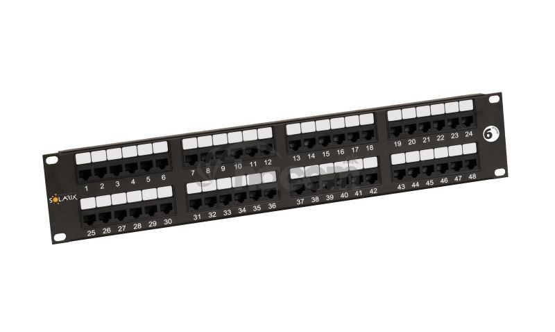 Nestíněný patch panel s označením SX48-6-UTP-BK je vysoce kvalitní panel kategorie 6, který je testován pro šířku pásma až do 350 MHz, čímž převyšuje požadavky na komponenty definované ve standardech ANSI/TIA 568, ISO/IEC 11801 a EN 50173 pro kategorii 6 a třídu vedení Class E, včetně všech nejnovějších dodatků. Panel je dodáván 48 porty RJ45 a je osazen moduly s duální IDC svorkovnicí 110/Krone. Kontakty jsou na svorkovnici z důvodu snadného zakončení datového kabelu označeny barvami podle typu zapojení, a to buď podle standardu T568A, nebo T568B. Panel SX48-6-UTP-BK patří do skupiny komponentů systému Solarix - kategorie 6 a stejně jako všechny komponenty v této produktové řadě jsou vyrobeny tak, aby poskytovaly maximální životnost, vynikající výkon, spolehlivost a především jednoduchou instalaci. Barva tohoto patch panelu Solarix kategorie 6 je černá, velikost 2U.