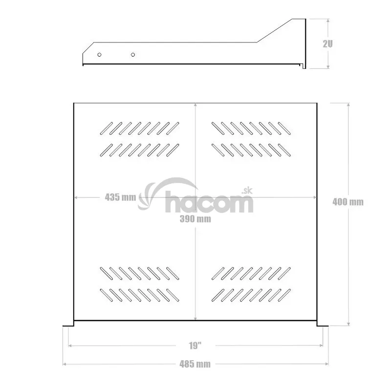 19 "nízkoprofilová police s uchytením 2U. V porovnaní so štandardnou policou má tento typ nižšiu nosnosť, ale v rozvádzači nezaberá 1U. Vďaka svojej konštrukcii tak umožňuje plné využitie inštalačných pozícií v rozvádzači. Takéto riešenie je výhodou najmä pri stiesnených inštaláciou alebo v prípade nástenných rozvádzačov . Perforované telo police zaisťuje prúdenie vzduchu. police hlboké 280 mm a 400 mm sa inštalujú len na prednej vertikálne lišty.