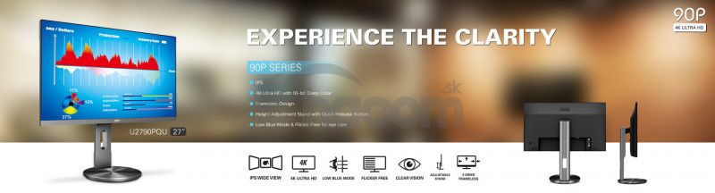 27 "AOC U2790PQU poskytuje silný výkon s rozlíšením 4K UHD (3840 x 2160), dostupným dizajnom a panelom IPS so širokými zornými uhlami. Dodáva sa s pohodlným pripojením USB 3.0 pre prenos dát a nabíjanie multimediálnych zariadení. Užívatelia si môžu vychutnať obsah z externých zdrojov prostredníctvom pripojenia HDMI a DisplayPort.* Nízky modrý režim - Modrý režim AOC Low Blue umožňuje užívateľovi znížiť emisie krátkych vlnových dĺžok modrej obrazovky bez straty presnosti farieb. Tiež ponúka štyri rôzne režimy filtrovania - čítanie, prehľadávanie webu, multimédiá a kanceláriu.