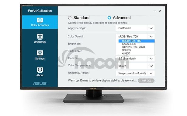 * Technológia kalibrácie ASUS ProArt ™ obsahuje 14-bitovou vyhľadávaciu tabuľku (LUT), kompenzáciu rovnomernosti a možnosť ukladať profily farieb na monitor.