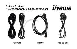 Obsah balenia: Napájací kábel (1,8m), HDMI kábel (1,8m), RS-232c kábel (1,8m), užívateľský manuál, Wall mount bracket, Wall mount guide, Screws, Screw anchors, Stickers for screw holes, diaľkové ovládanie (vrátane batérie)