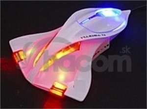 Veľmi zaujímavá optická myš v tvare stíhacieho lietadla so svietiacou kabínou, tryskami a motory zaujme každého správneho fanúšika lietadiel. Veľmi dobre padne aj do ruky. Kvalitné balenie vynikne aj na pultoch obchodov. Myš využíva najnovšie senzory o rozlíšení 800dpi s optimalizáciou na rýchlosť ak dispozícii máte štandardné tri tlačítka s rolovacím tlačidlom. Myš je pripojiteľná cez USB aj PS / 2. Dodáva sa vo viacerých farebných prevedeniach.