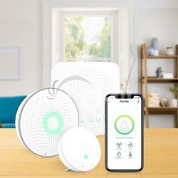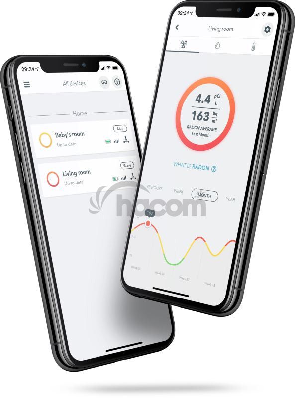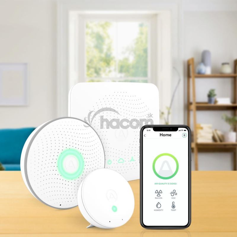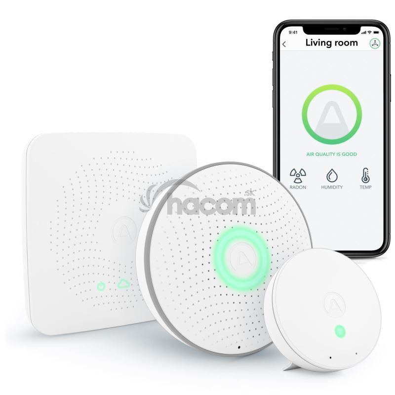 Táto sada zahŕňa: Wave, prvý inteligentný radónový detektor, Wave Mini s indikáciou rizika vzniku plesní, vzdušné chemikálie (VOC), senzory vlhkosti a teploty a Hub, ktorý prenáša všetko online.
