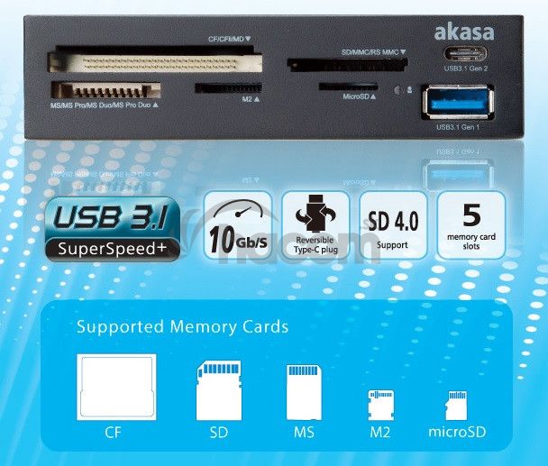 Čítačka pamäťových kariet do pozície 3,5 "ponúka 5 slotov pre pamäťové karty, jeden port USB 3.0 a jeden port USB typu C. Pripojenie k základnej doske je realizované cez interný konektory USB 3.1 Gen1 + a USB 3.1 Gen2.Špecifikácia: