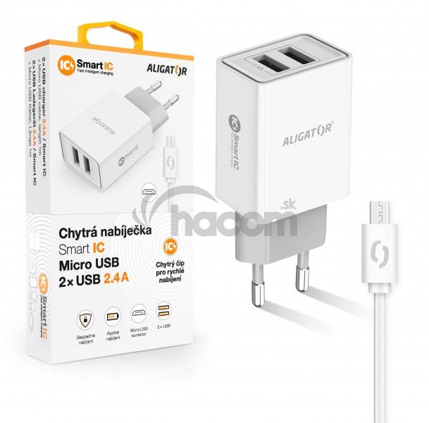- ALIGATOR Múdra sieťová nabíjačka 2,4A, 2xUSB, smart IC, biela, micro USB kábel CHA0032