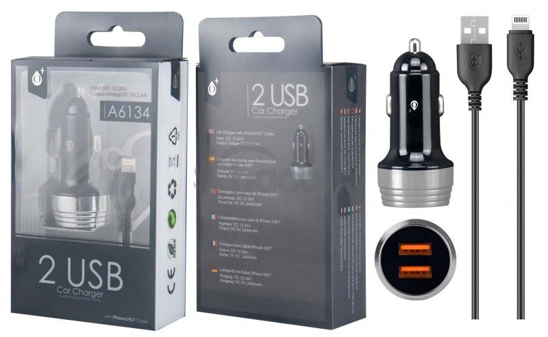 Elegantná nabíjačka do auta s lightning káblom a dvoma USB porty. Skvele zapadne do interiéru vášho auta.* Vstup 12V-24V