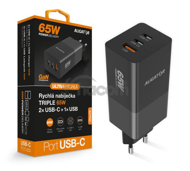 - Aligator nabíjačka PD65W, 2USB-C, 1xUSB-A, čierna CHPD0027