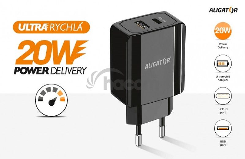 - Aligator POWER DELIVERY 20W, USB + USB-C, čierna CHPD0004