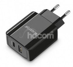 Výkonná sieťová nabíjačka radu "POWER DELIVERY" v elegantnom čiernom prevedení s USB-A portom a ultra rýchlym USB-C portom o výkone 20W.