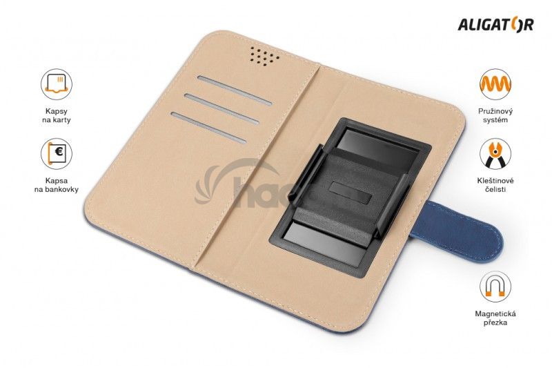 Dokonale prepracovaný dizajn, tenké prevedenie, priehradky na kartu alebo vizitky, pozdĺžne vrecko na bankovky, zatváranie pomocou magnetickej pracky, ľahké uchytenie mobilného telefónu pomocou výsuvných čeľustí z kvalitného plastu, ktoré sú určené pre opakované umiestnenie telefónu.