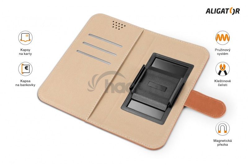 Dokonale prepracovaný dizajn, tenké prevedenie, priehradky na kartu alebo vizitky, pozdĺžne vrecko na bankovky, zatváranie pomocou magnetickej pracky, ľahké uchytenie mobilného telefónu pomocou výsuvných čeľustí z kvalitného plastu, ktoré sú určené pre opakované umiestnenie telefónu.