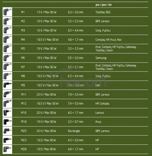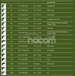 Vhodné pre značky Acer, Toshiba, IBM, Lenovo, Sony, Asus, HP, Dell, Samsung, Fujitsu a ďalšie Balenie obsahuje sadu 16 výmenných konektorov rôznych priemerov, ktoré zaručia kompatibilitu s najpredávanejšími modelmi notebookov.