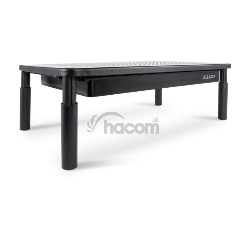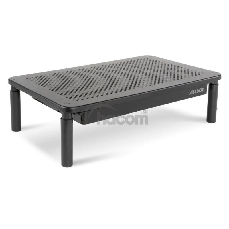 Kovový Art Tri-Level výškovo nastaviteľný stojan na monitor so zásuvkouTrojrovňový stojan na monitor Allsop Metal Art má odolnú kovovú platformu s práškovým nástrekom s perforovanými otvormi s mikrobodkami a podporuje monitory až do hmotnosti 35 lb a 27 palcov. Teleskopické nohy umožňujú používateľom vybrať si z troch úrovní výšky (4,13 palca, 5,0 palca alebo 5,75 palca) pre ideálny ergonomický komfort. Integrovaná úložná zásuvka je ideálnym miestom pre ďalšie zásoby a má slot pre telefón pre ľahký prístup.