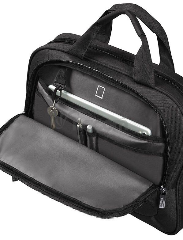 taška je rozdelená do dvoch častí - v jednej je priestor pre tablet + organizér, v druhej polstrovaná priehradka na notebook + voľný priestor
