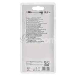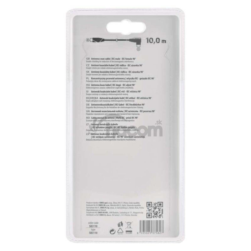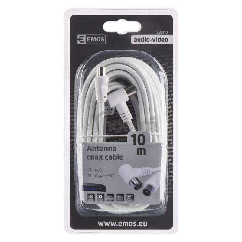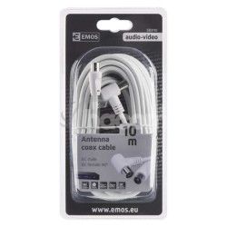 Anténny koaxiálny kábel s vidlicou a zásuvkou IEC. Kábel má uhlový konektor (90°). Kábel má dvojité tienenie pre redukciu elektromagnetického rušenia. Dĺžka kábla je 10 m. Koaxiálny kábel je vhodný pre SAT, DVB-T, ANT, DECODER, FLAT TV a TV.
