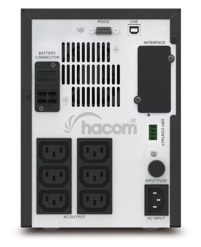 Výstupné prípojky: (6) IEC 320 C13 (Záložná prevádzka na batérie)