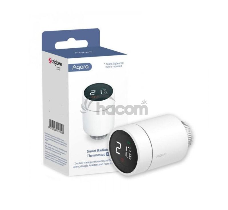 Radiátorový termostat, ktorý je možné použiť s väčšinou vodných radiátorov, ako sú ohrievače priestoru, ohrievače uterákov alebo dokonca podlahové kúrenie. Je schopný sťahovať dáta z externých snímačov Aqara a podľa nich upravuje vykurovací výkon. V prípade rizika zamrznutia potrubia sa automaticky zapne kúrenie. Navyše vďaka výkonnej automatizácii Aqara Home je možné v prípade prudkého poklesu vonkajšej teploty miestnosť predhriať, aby sa kompenzovala zmena teploty. Po niekoľkých týždňoch používania nie je potrebné meniť batérie. Vďaka protokolu Zigbee a energeticky účinnému hardvéru vydržia batérie termostatu Aqara Radiator Thermostat až jeden rok.
