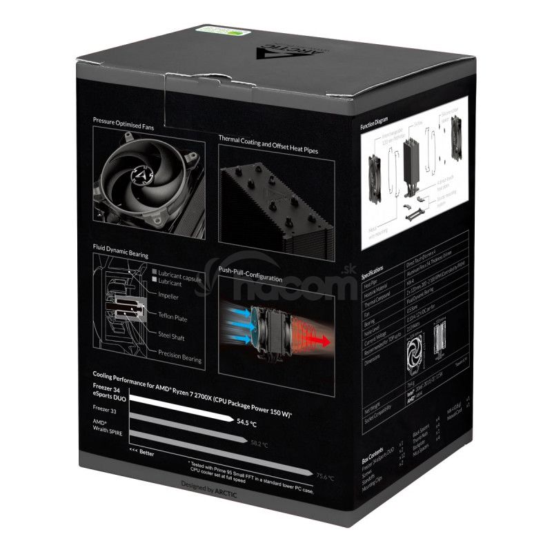 The two BioniX P-fans of the Freezer 34 eSports DUO work in push-pull-configuration Výsledný increase of airflow ensures that more cold air is transported into the heatsink for cooling and the heat from the CPU is dissipated even faster from the heat sink . This ensures the best possible performance of the CPU.