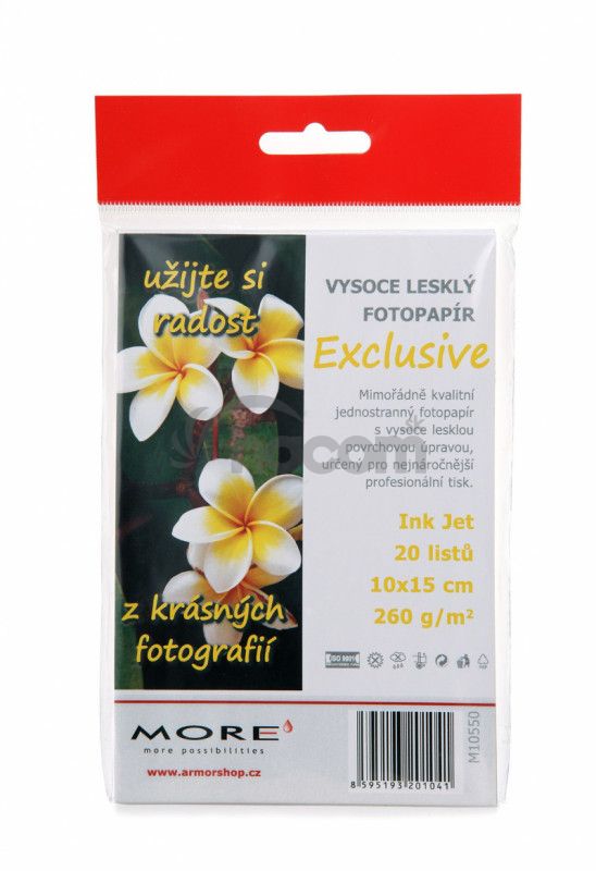 ARMOR Fotopapier MORE Exclusive je predurčený pre kvalitné aj ten najnáročnejší tlač fotografií v atramentových tlačiarňach. Ide o jednostranne poťahovaný fotopapier s vysoko lesklou povrchovou úpravou, vďaka ktorej majú fotografie vždy vysoký kontrast pri zachovaní prirodzených farieb.Balenie obsahuje 20 listov formátu 10x15 cm gramáže 260 g / m ^ 2.