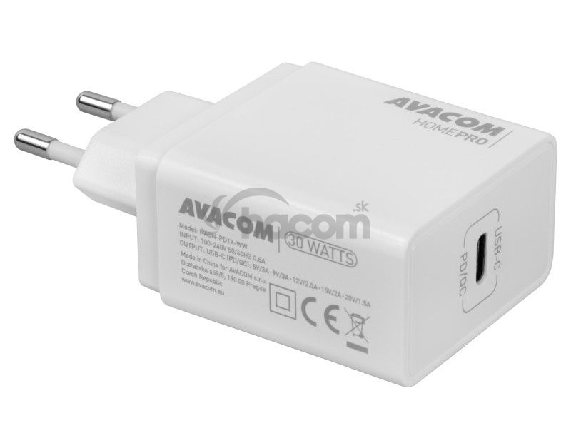 Sieťová nabíjačka s výstupným konektorom USB-C, rýchlonabíjanie Power Delivery a Qualcomm Quick Charge 4.0.Sieťová nabíjačka AVACOM HomePro s podporou technológiou Power Delivery a Qualcomm Quick Charge 4 umožňuje veľmi rýchle nabíjanie zariadení pripojených prostredníctvom konektora USB-C, ktoré môže nabíjať výkonom až 30W.