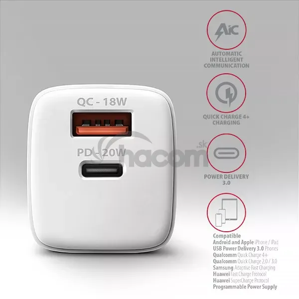 Kompaktná nabíjačka do siete AXAGON ACU-PQ20W umožňuje rýchle nabíjanie až dvoch mobilných zariadení súčasne . Vďaka celkovému výkonu 20W dokáže nabíjačka dobíjať telefóny, tablety a ďalšie mobilné zariadenia najvyššou možnou rýchlosťou. Adaptér ponúka nielen štandardný USB-A konektor , ale aj obojstranný USB-C konektor .Nabíjačka je vybavená výstupmi Power Delivery 3.0/Quick Charge 4+ USB typu C a Quick Charge 3.0 USB typu A, čo umožňuje rýchle nabíjanie smartfónov a tabletov výkonom až 20W .