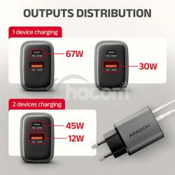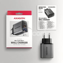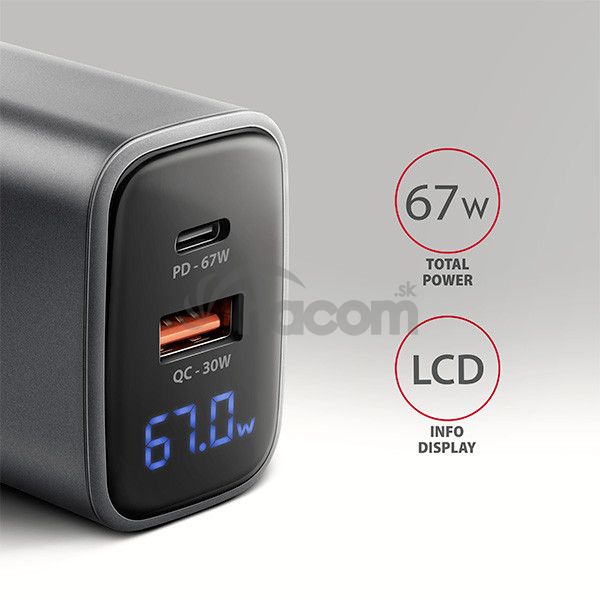 - AXAGON ACU-PQ67D, GaN nabíjačka do siete 67W, výstup USB-A+USB-C, PD3.0/PPS/QC4+/SFC2.0/Apple, LCD ACU-PQ67D