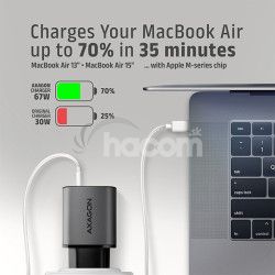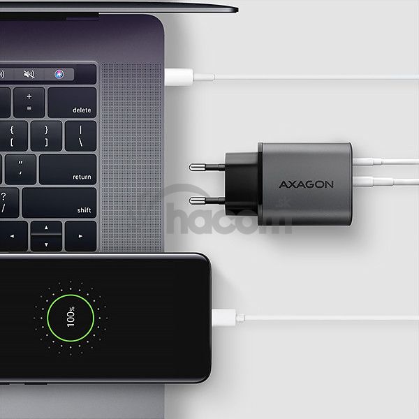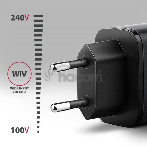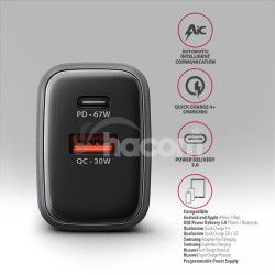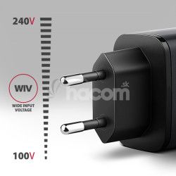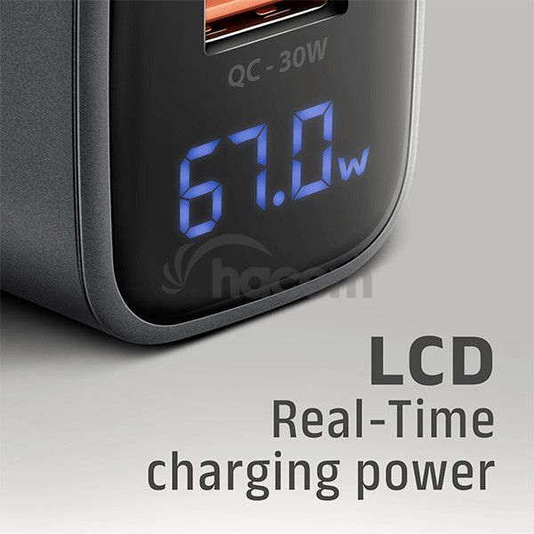 Cestovná nabíjačka do siete AXAGON ACU-PQ67D GaN umožňuje rýchle nabíjanie až dvoch mobilných zariadení súčasne . Vďaka celkovému výkonu 67W dokáže nabíjačka dobíjať notebooky, tablety, telefóny a ďalšie mobilné zariadenia najvyššou možnou rýchlosťou. Adaptér ponúka nielen štandardný USB-A konektor , ale aj oboustranný USB-C konektor . Prehľadný LCD displej zobrazuje aktuálne výkon nabíjania.Kompaktná veľkosť a vysoký výkon je daný využitím novej GaN technológie . Použité súčiastky s Nitridom Galia pracujú s vysokou účinnosťou, čo umožňuje dosahovať vysoké výkony pri malej veľkosti. Nabíjačka je vybavená výstupom Power Delivery 3.0/Quick Charge 4+ USB typu C a Quick Charge 3.0 USB typu A, vďaka čomu umožňuje rýchle nabíjanie nielen smartfónov a tabletov, ale aj notebookov.