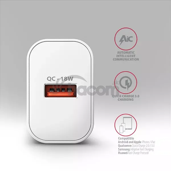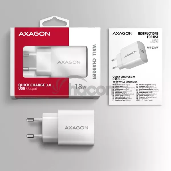 USB nabíjačka do siete AXAGON ACU-QC18W je určená pre nabíjanie mobilných zariadení . Vďaka maximálnemu výkonu 18W dokáže nabíjačka dobíjať telefóny, tablety a ďalšie mobilné zariadenia najvyššou možnou rýchlosťou. Adaptér ponúka štandardný USB-A konektor .Nabíjačka je vybavená výstupom Quick Charge 3.0 USB typu A, čo umožňuje rýchle nabíjanie smartfónov a tabletov výkonom až 18W . Adaptér je tiež kompatibilný s ďalšími štandardmi rýchleho nabíjania telefónov, ako sú Apple iPhone, iPad, Samsung, Huawei, Honor, Xiaomi, Motorola a ďalších.