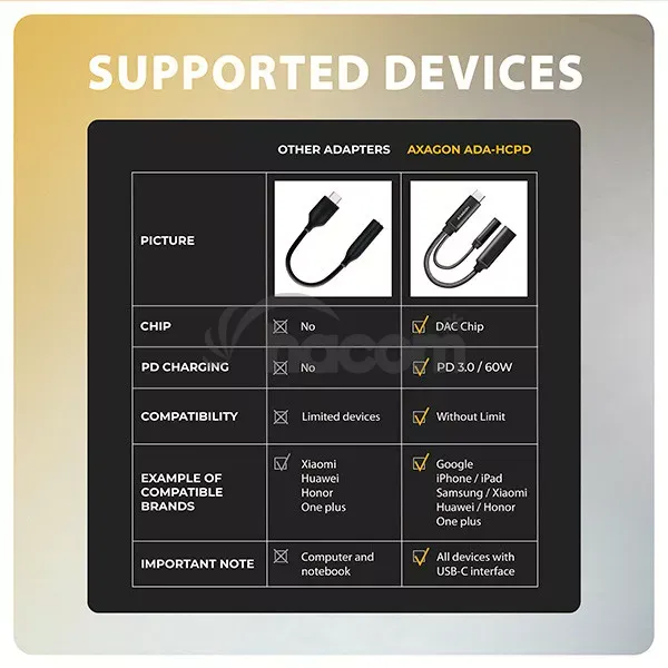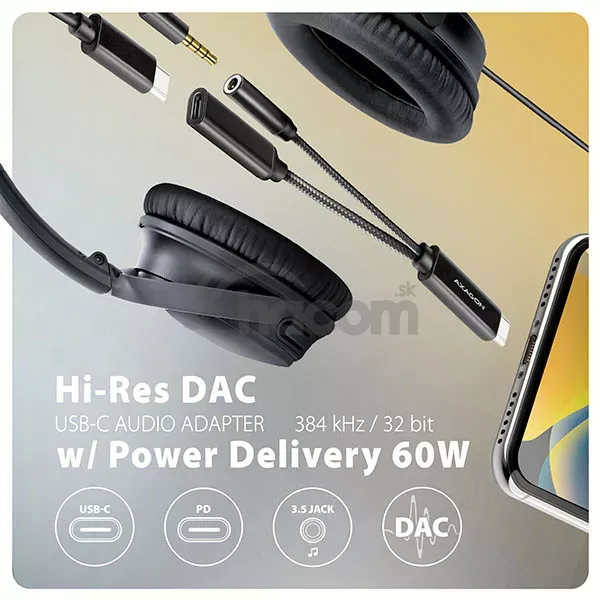 AXAGON ADA-HCPD Hi-Res DAC AUDIO ADAPTER je ideálnym doplnkom pre váš telefón, tablet, notebook alebo stolný počítač s USB-C konektorom, ktorý vám poskytne chýbajúci 3.5 mm audio jack. Veľkú výhodu predstavuje integrovaný konektor Power Delivery , ktorý umožňuje súčasné pripojenie nabíjačky a tým poskytuje možnosť napájania pripojeného telefónu. Adaptér obsahuje vysoko kvalitný DAC prevodník , ktorý pri prehrávaní ponúka vzorkovanie až 384 kHz / 32 bitov, čo zaisťuje vynikajúcu zvukovú kvalitu.USB-C female konektor je vyhradený iba pre nabíjanie telefónov alebo notebookov pomocou technológie Power Delivery 3.0 výkonom až 60W . Do konektora zapojíte vhodnú nabíjačku a zvukovku pripojíte k telefónu. Zabudnite na neustále odpájanie slúchadiel kvôli nabíjaniu, užite si nepretržitú zábavu pri počúvaní hudby, sledovaní filmu alebo hraní hier.