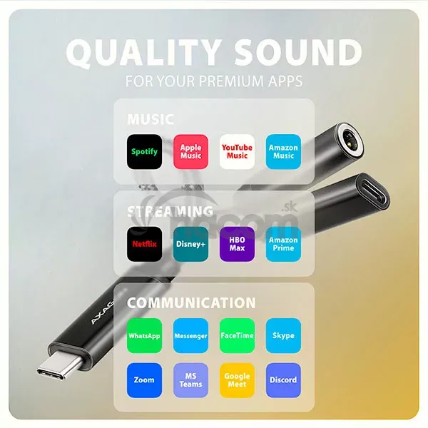 Táto zvuková karta je optimálna pre bezstratové formáty ako FLAC, WMA, WAV, APE, AAC alebo ALAC atď. Počúvanie hudby v najvyššej možnej kvalite je dostupné prostredníctvom prémiových účtov platforiem ako sú Spotify, Apple Music, YouTube Music a Amazon Music Unlimited. Okrem toho, môžete tento audio adaptér využiť aj na nerušené sledovanie ďalších obľúbených streamovacích služieb, ako sú Netflix, Disney+, HBO Max, Amazon Prime alebo Apple TV+.