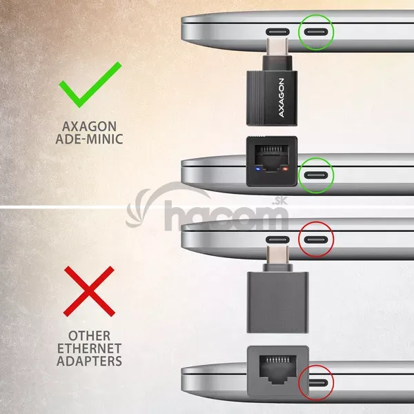 Externá sieťová karta AXAGON ADE-MINIC ľahko premení USB-C 3.2 Gen 1 port na Gigabit Ethernet port . USB sieťovka kompatibilná s rýchlosťami 10/100/1000 Mbit/s rozšíri počítač o rýchle a stabilné sieťové pripojenie, doplní chýbajúci sieťový RJ-45 konektor , pridá ďalšiu sieťovú kartu alebo nahradí pôvodné nefunkčné sieťové pripojenie.LAN adaptér ponúka okrem gigabitovej priepustnosti širokú škálu funkcií napr. IPv4/IPv6 checksum pre zníženie záťaže CPU kontrolnými súčtami, crossover detekciu a autokorekciu, TCP large send offload, podporu práce s VLAN alebo pokročilé funkcie Power Managementu.
