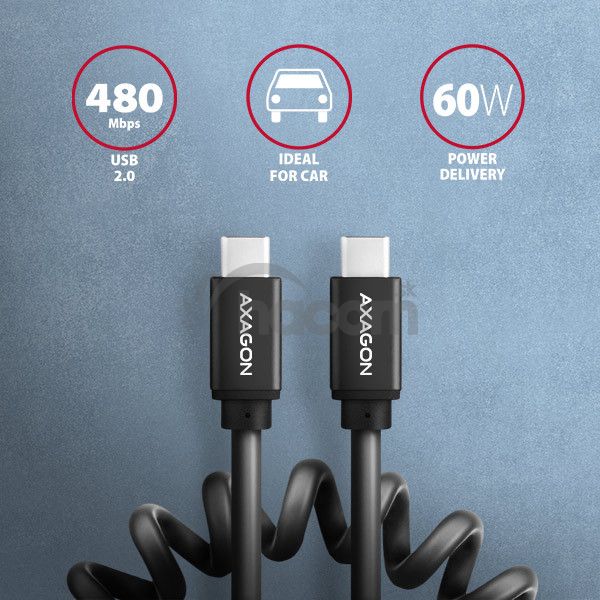 Krútený prepojovací USB-C <-> USB-C dátový a nabíjací AXAGON BUCM-CM20TB TWISTER USB 2.0 kábel s konektormi USB-C male na oboch koncoch. Kábel je navrhnutý na synchronizáciu dát a nabíjanie notebookov, telefónov, tabletov a ďalších mobilných zariadení. Kábel podporuje prenos dát rýchlosťou až 480 Mb/s , je kompatibilný s nabíjacími technológiami Power Delivery 60W , Quick Charge, Samsung AFC, Huawei FCP, SMART a ďalšími. Pripojené zariadenie je možné nabíjať prúdom až 3A .Odolný dátový a napájací kábel s predĺženou životnosťou je opatrený kovovými koncovkami , konektormi s poniklovaným povrchom a pozlátenými kontaktmi. Vodiče kábla sú vyrobené z pocínovanej bezkyslíkatej medi. Kvalitná izolácia kábla, vyrobená z flexibilného TPE, zaručuje maximálnu odolnosť, ale zachováva aj dostatočnú ohybnosť. Vďaka krútenému a naťahovaciemu prevedeniu kábel zaberá minimum miesta a je tak ideálnym doplnkom do auta . V skrátenom stave je kábel dlhý len 50 cm a nikde neprekáža. V natiahnutom stave pohodlne dosiahne 110 cm ďaleko od zásuvky.