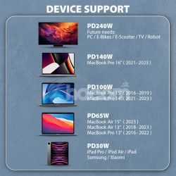 • Podporované technológie nabíjania: Power Delivery 2.0/3.0/3.1 240W (48V/5A), Qualcomm Quick Charge 2.0/3.0/4+, Samsung Adaptive Fast Charging, Huawei Fast Charge Protocol, SMART Charging a ďalšie.