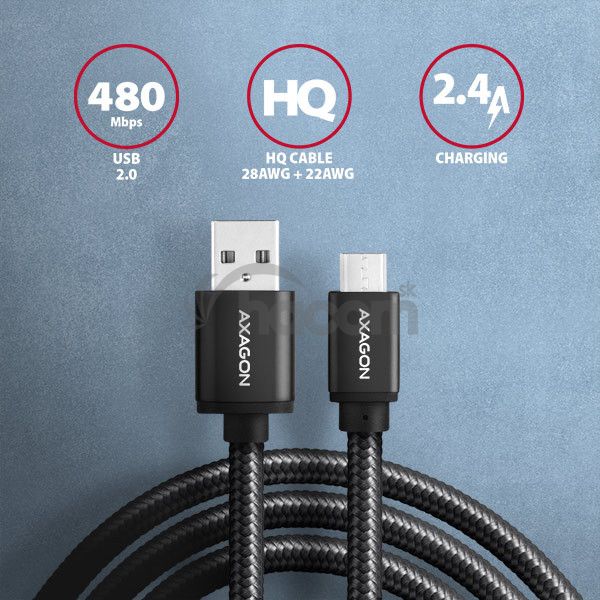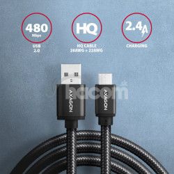 - AXAGON BUMM-AM20AB, HQ kabel Micro USB USB-A, 2m, USB 2.0, 2.4A, ALU, oplet, černý BUMM-AM20AB