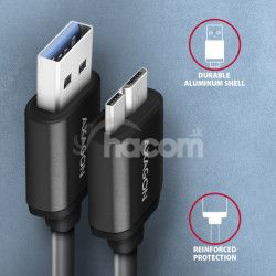 Prémiový prepojovací Micro-B USB <->USB-A dátový a napájací AXAGON BUMM3-AM10AB SPEED USB 3.0 kábel s konektormi Micro-B USB male a USB-A male. Kábel je navrhnutý pre rýchle dátové prenosy a napájanie externých pevných diskov a ďalších mobilných zariadení. Podporuje prenos dát rýchlosťou až 5 Gb/s a napájanie prúdom až 3A.
