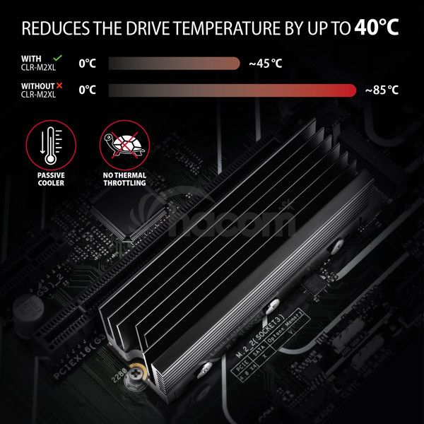 Pasívny hliníkový chladič AXAGON CLR-M2XL ALU pre extrémne chladenie výkonných M.2 SSD diskov, najmä NVMe. Univerzálny heatsink je možné použiť na M.2 karty o rozmere 22 x 80 mm . Dodávané teplovodivé podložky, umožnia montáž chladiča pre všetky jednostranné aj obojstranné M.2 SSD disky .Rebrovaný hliníkový XL pasív vysoký 32 mm, spolu s kovovým rámčekom, napomáha optimálne odvádzať teplo vzniknuté pri prevádzke M.2 SSD disku a umožňuje tak znížiť teplotu disku až o 40 °C . Predlžuje sa tak životnosť SSD disku a zamedzí odpísať spomaľovaniu rýchlosti disku tzv. „Thermal Throttling“.