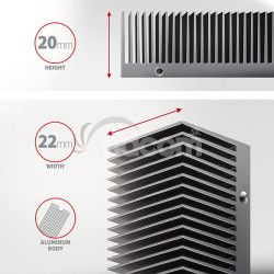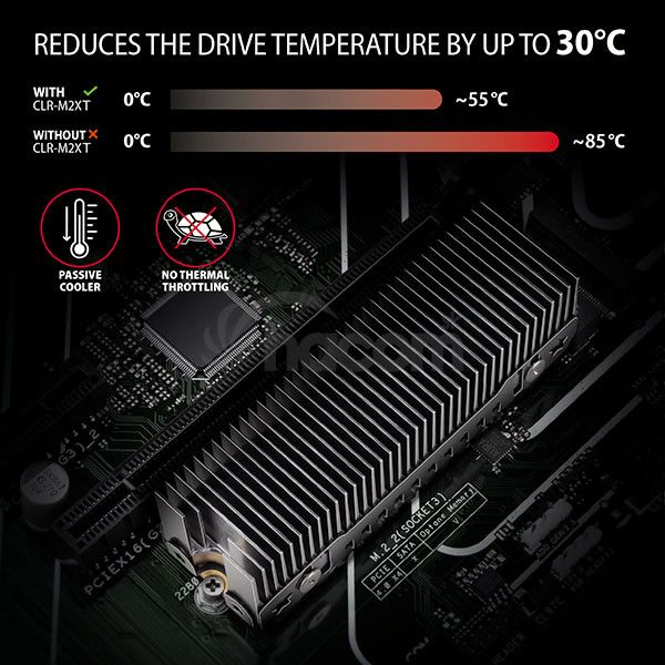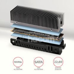 AXAGON CLR-M2XT ALU je pasívny hliníkový chladič určený pre intenzívne chladenie výkonných NVMe M.2 SSD diskov. Univerzálny heatsink je možné použiť pre M.2 karty o rozmere 22 x 80 mm . Dodávané teplovodivé podložky, umožnia montáž chladiča pre všetky jednostranné aj obojstranné M.2 SSD disky .Vďaka svojej celkovej výške 24 mm a pasívu s výškou 20 mm, je možné chladič umiestniť aj do skrine s obmedzeným priestorom. Priečne rebrovanie hliníkového pasívu a kovový rámček optimalizujú odvod tepla z M.2 SSD disku, čo môže znížiť teplotu disku až o 30 °C . Tým sa predlžuje životnosť SSD disku a zabraňuje sa spomaleniu rýchlosti disku, tzv. "Thermal Throttling".