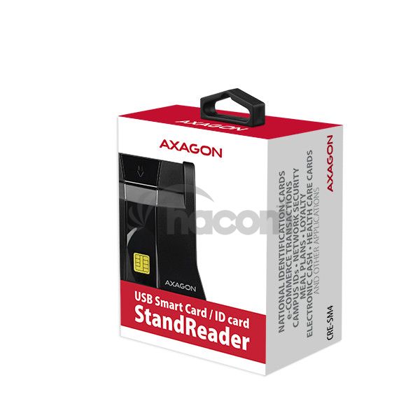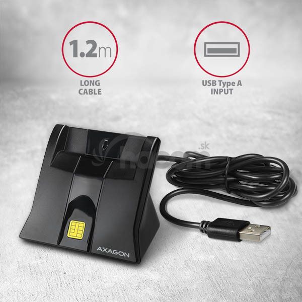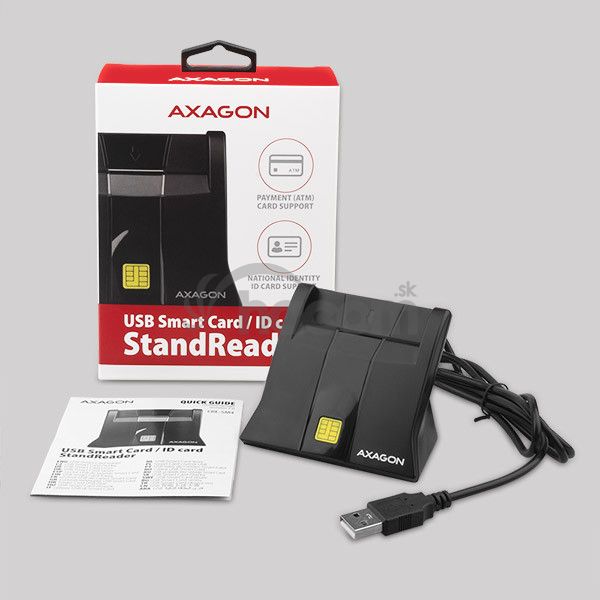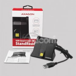 Stojánková stolný čítačka Smart card / ID card AXAGON CRE-SM4 StandReader s USB 2.0 rozhraním. Card reader podporuje všetky bežné formáty kontaktných Smart kariet, čipových kariet a ďalších kariet vrátane kontaktných bankových platobných kariet alebo kontaktných elektronických občianskych preukazov *. Čítačka je plne kompatibilná s aplikáciou eObčanka.Kompatibilita so všetkými bežnými OS ako Windows, Linux a Mac OS umožňuje široké využitie. Múdra LED indikácia svieti len krátku chvíľu po zmene aktivity, potom zhasne a neruší užívateľa zbytočným svitom. Praktický dizajn, kvalitné prevedenie, protišmyková podložka a dostatočne dlhý kábel zaisťujú jednoduché a bezproblémové použitie.