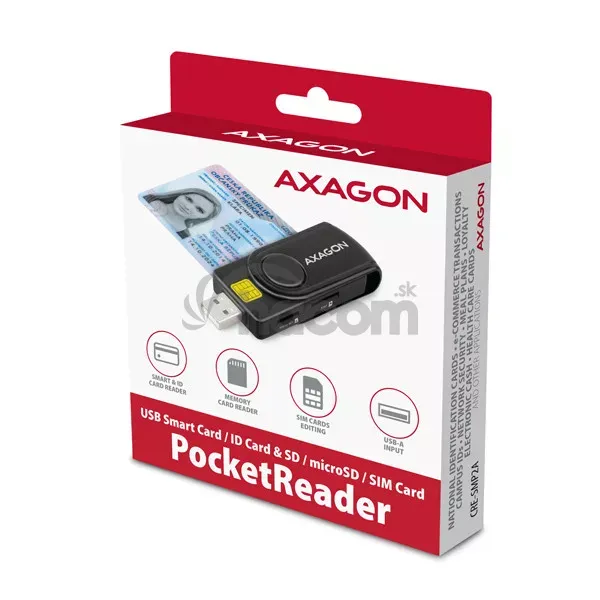 Kompaktná cestovná čítačka Smart card/ID card AXAGON CRE-SMP2A PocketReader s USB 2.0 rozhraním obsahuje navyše sloty pre pamäťové karty SD, microSD a SIM karty. Card reader podporuje všetky bežné formáty kontaktných Smart kariet , čipových kariet a ďalších kariet vrátane kontaktných bankových platobných kariet alebo kontaktných elektronických občianskych preukazov . Čítačka je plne kompatibilná s aplikáciou eObčanka (CZ), alebo eID klient (SK).Vďaka slotu pre SIM kartu vrátane SW pre správu SIM, slotom pre SD a microSD karty je možné čítačku využiť aj pre zálohu a prenos dát.