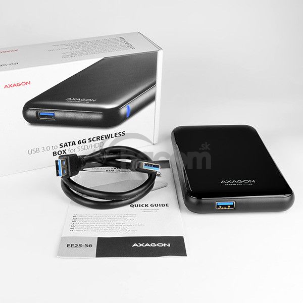 Univerzálny plastový externý box AXAGON EE25-S6B SCREWLESS BLACK s USB 3.0 a SATA 6G rozhraním určený pre 2.5 "SATA pevné disky alebo SSD.Rýchla a jednoduchá výmena diskov v boxe bez potreby skrutkovania rozširuje možnosti využitia napr. Pre migráciu dát, testovanie atď.