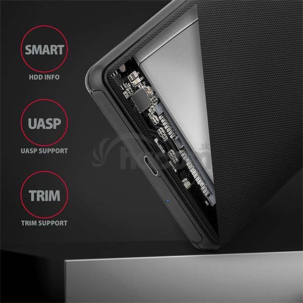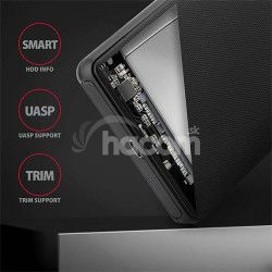 Ľahký Bezšroubková externý AXAGON EE25-SLC SLIDE BOX s USB 3.2 Gen 1 (USB 3.0) a SATA 6G rozhraním je určený pre všetkých 2.5 "SATA pevné disky alebo SSD. Spoľahlivé a pohodlné pripojenie umožňuje obojstrannú USB-C konektor.SATA 6G rozhranie s podporou UASP dovolí užívať si rýchlosť moderných SSD diskov. Podpora funkcie TRIM pre obmedzenie pozvoľné degradácie výkonu SSD v čase. Čítanie SMART informácií monitorujúcich kondíciu externého disku. Podpora uspávanie pripojeného disku aj boxu.