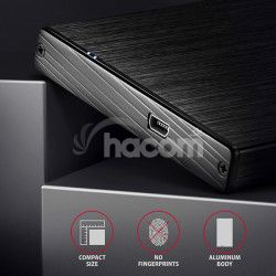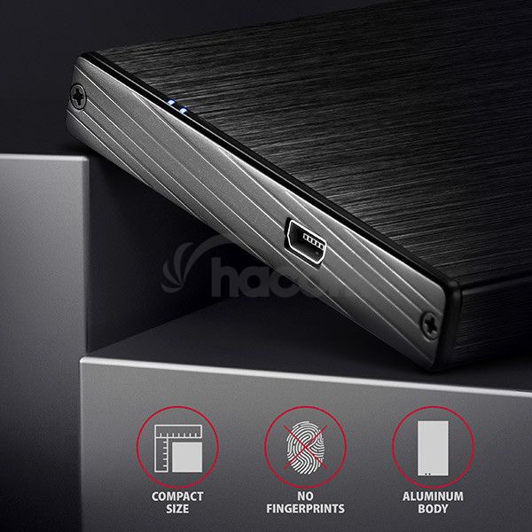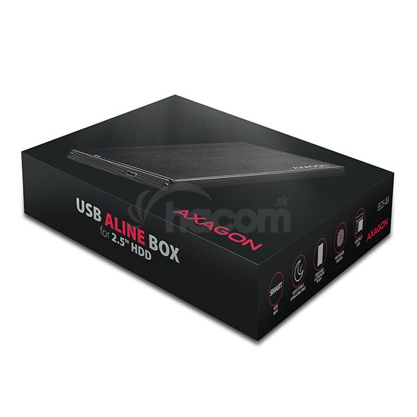Kompaktný hliníkový externý box AXAGO EE25-XA ALINEbox s USB 2.0 rozhraním určený pre 2.5 "SATA disky.Čítanie SMART informácií monitorujúcich kondíciu externého disku.
