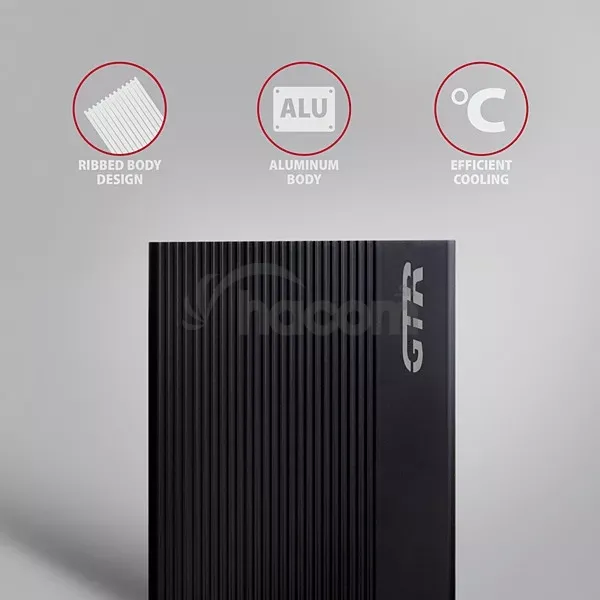 Vnútorný rámček boxu dobre fixuje a chráni vložený disk. Rebrované hliníkové telo boxu napomáha chladeniu a ochrane disku. Gumové pásiky obmedzujú posúvanie po stole. Elegantný povrch boxu bráni nežiaducim odtlačkom prstov.