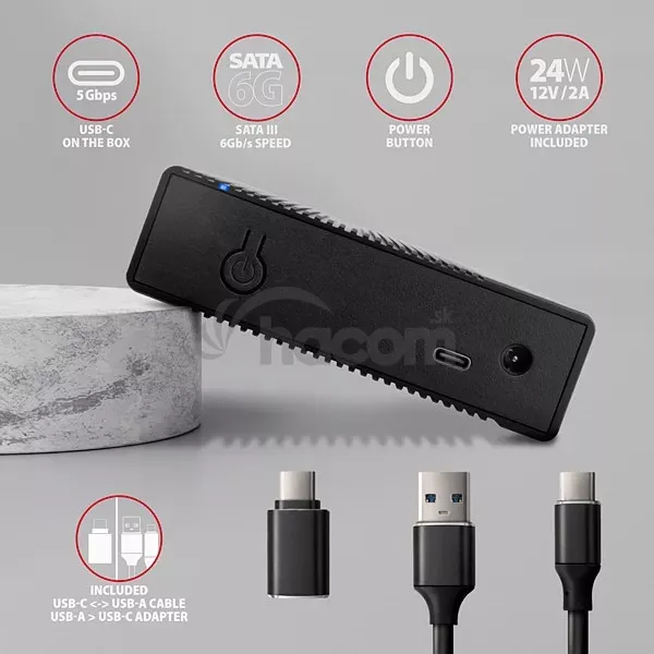 • USB-C 5Gbps externý box pre 3.5" SATA disk,