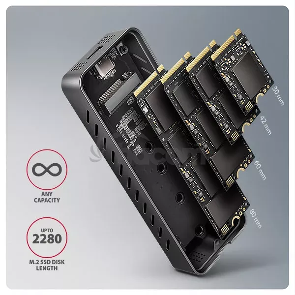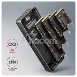 Výhodou boxu je uchytenie rovno pre štyri rôzne dĺžky SSD disku – 30, 42, 60 a 80 mm. M.2 disky môžu byť jednostranné alebo obojstranné. Box nemá obmedzenie kapacity vloženého SSD disku. Otváranie boxu pomocou jedinej skrutky uľahčuje montáž aj demontáž M.2 SSD disku. Výmena diskov je rýchla a jednoduchá a rozširuje tak možnosti využitia boxu napr. na migráciu dát, testovanie atď.