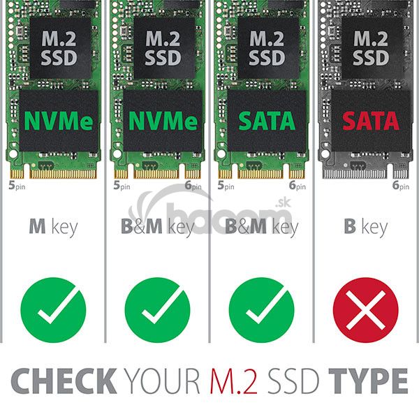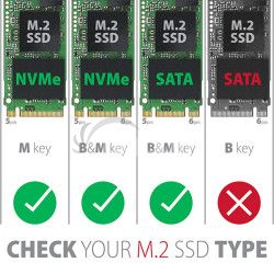 Unikátnou vlastnosťou , vďaka novému čipsetu, je možnosť použitia ako M.2 NVMe tak aj SATA diskov. Nemusíte tak premýšľať aký typ M.2 disku do boxu vložíte. Výhodou je uchytenie rovno pre tri rôzne dĺžky SSD kariet – 42, 60 a 80 mm. M.2 karty môžu byť jednostranné alebo obojstranné. Box nemá obmedzenie kapacity vloženého SSD disku.