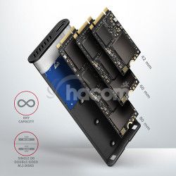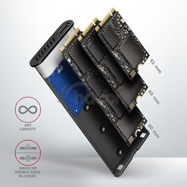 Unikátnou vlastnosťou , vďaka novému čipsetu, je možnosť použitia ako M.2 NVMe tak aj SATA diskov. Nemusíte tak premýšľať aký typ M.2 disku do boxu vložíte. Výhodou je uchytenie rovno pre tri rôzne dĺžky SSD kariet – 42, 60 a 80 mm. M.2 karty môžu byť jednostranné alebo obojstranné. Box nemá obmedzenie kapacity vloženého SSD disku.